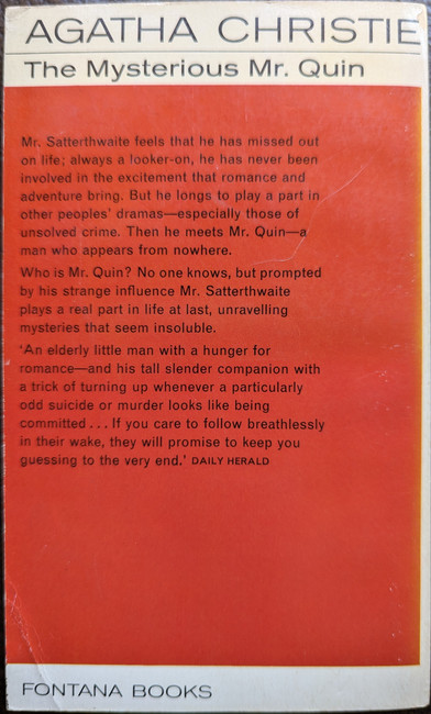 1050: The Mysterious Mr. Quin. This is the 1st Fontana printing. Cover art by Tom Adams. As a short story collection, it was potentially issued in a smaller print run which may be why it is slightly harder to find in its 1st printing version.